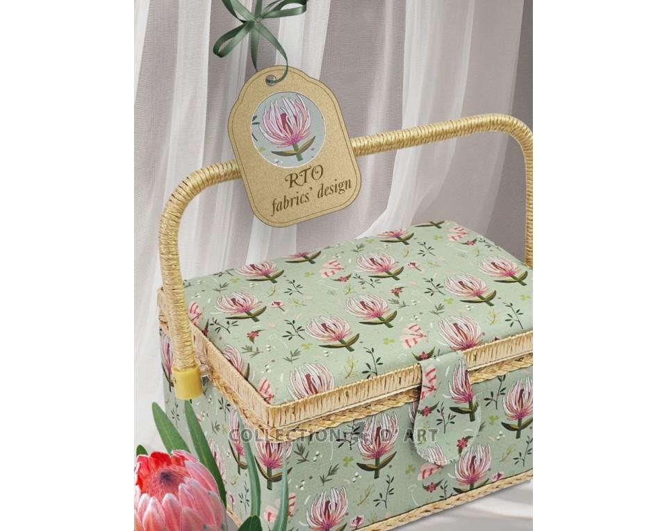 Description: There are a plastic insert with dividers, pincushion and a pocket for small parts storage inside of a sewing box.