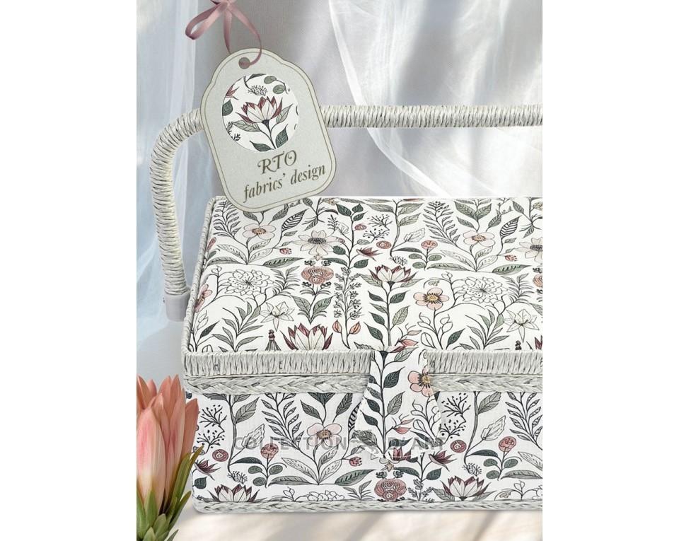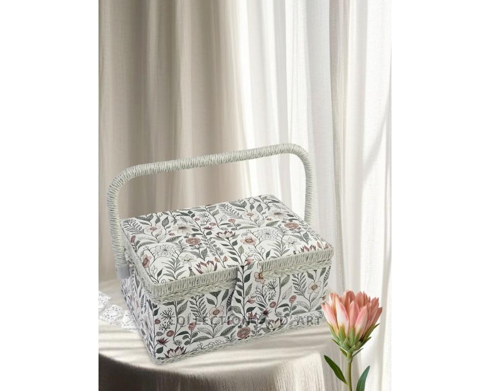 Description: There are a plastic insert with dividers, pincushion and a pocket for small parts storage inside of a sewing box.
