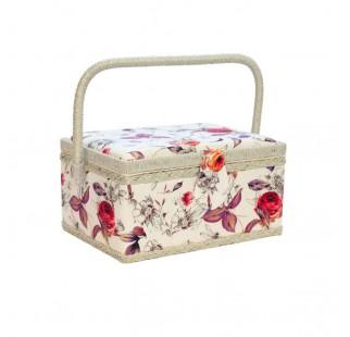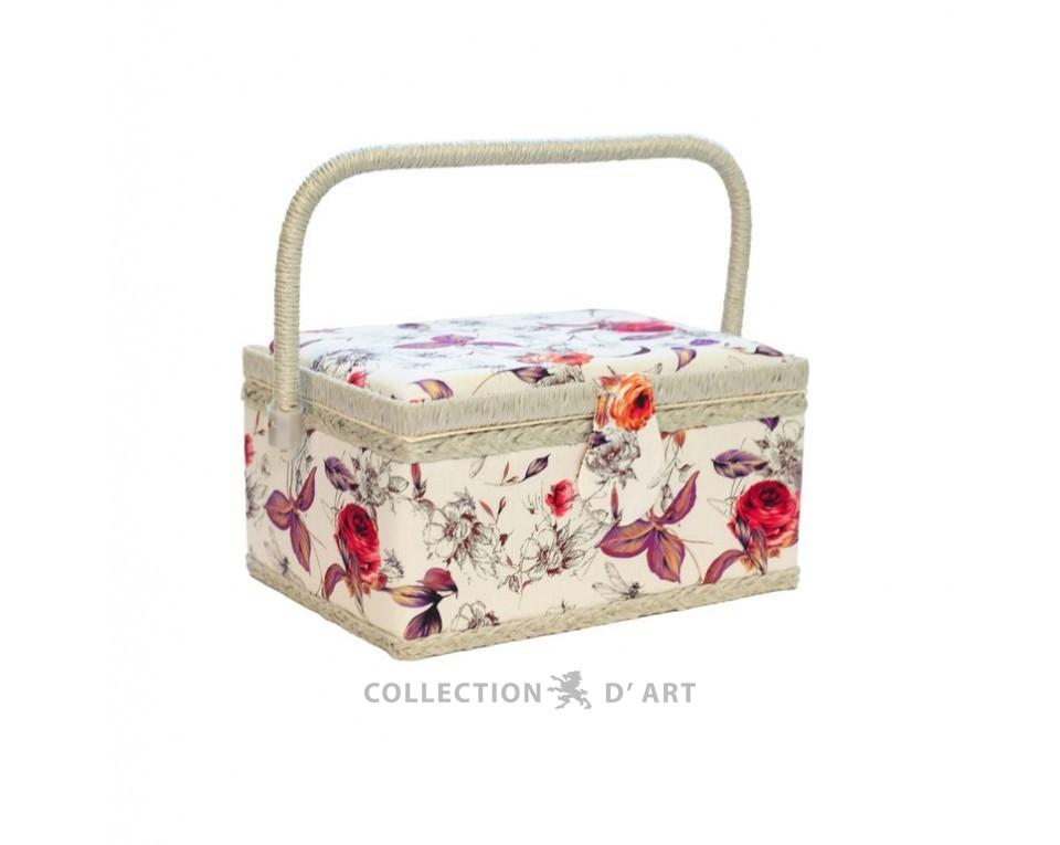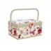 Description: There are a plastic insert with dividers, pincushion and a pocket for small parts storage inside of a sewing box.
