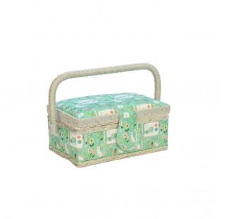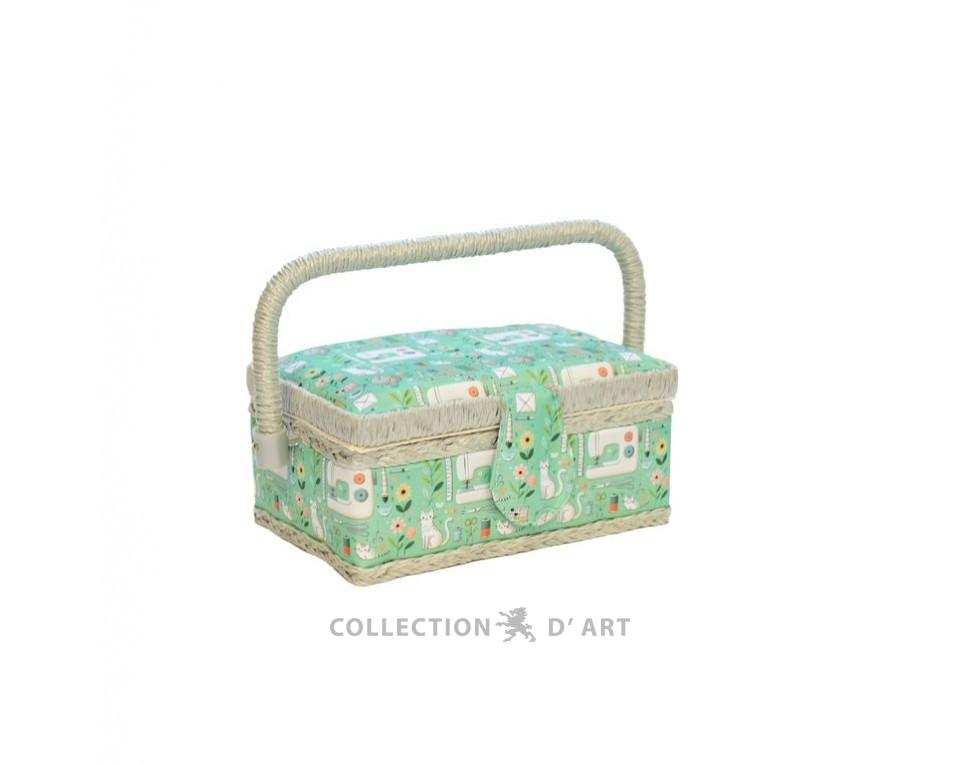 Description: There are a plastic insert with dividers, pincushion and a pocket for small parts storage inside of a sewing box.