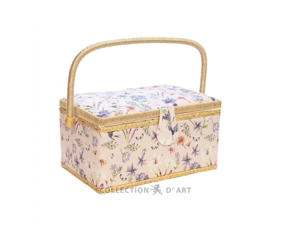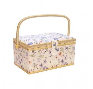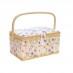 Description: There are a plastic insert with dividers, pincushion and a pocket for small parts storage inside of a sewing box.