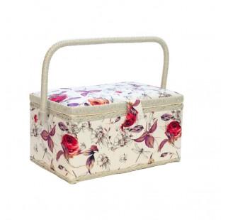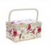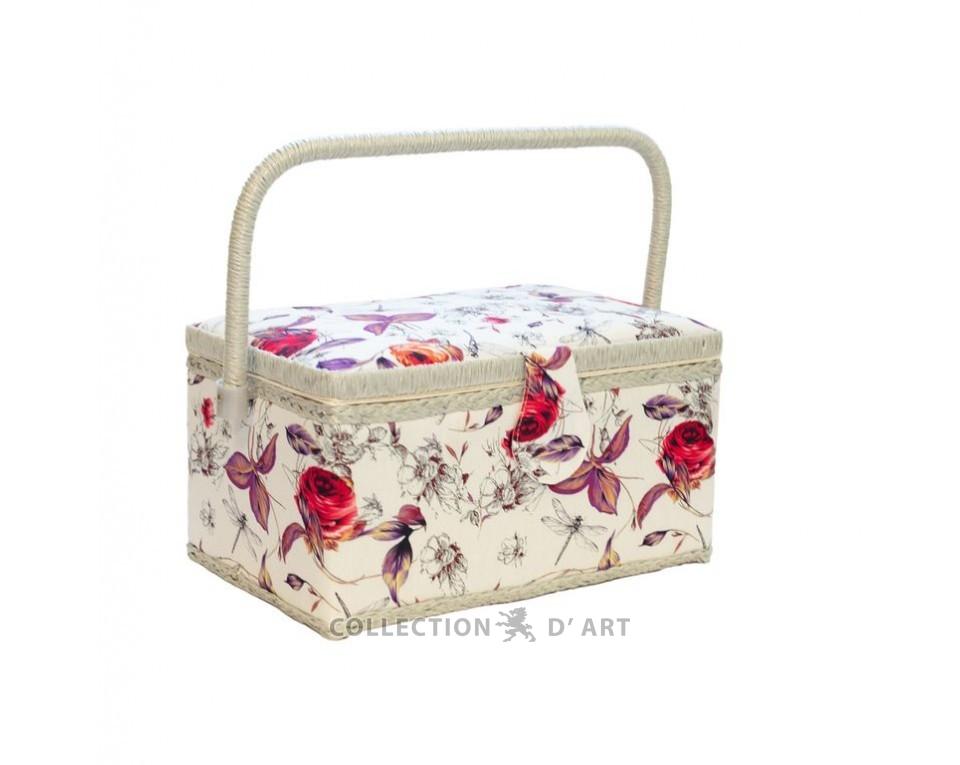 Description: There are a plastic insert with dividers, pincushion and a pocket for small parts storage inside of a sewing box.