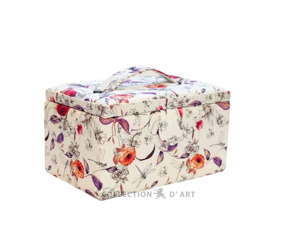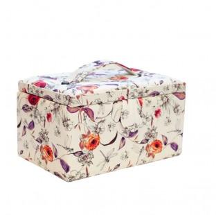 Description: There are a plastic insert with dividers, pincushion and a pocket for small parts storage inside of a sewing box.