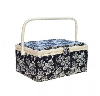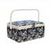Description: There are a plastic insert with dividers, pincushion and a pocket for small parts storage inside of a sewing box.