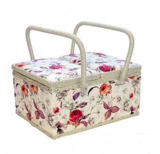 Description: There are a plastic insert with dividers, pincushion and a pocket for small parts storage inside of a sewing box.