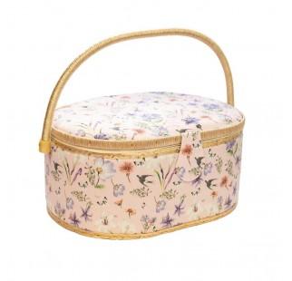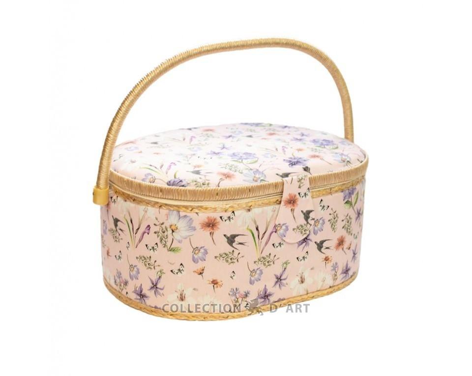 Description: There are a plastic insert with dividers, pincushion and a pocket for small parts storage inside of a sewing box.