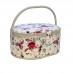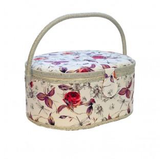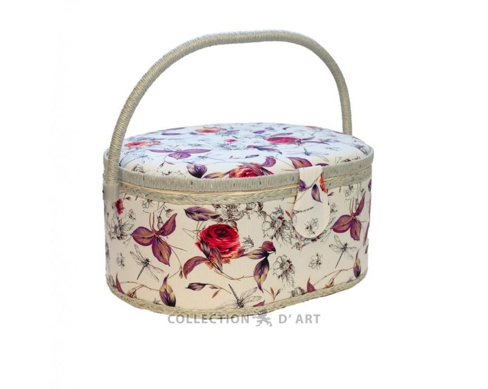 Description: There are a plastic insert with dividers, pincushion and a pocket for small parts storage inside of a sewing box.