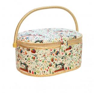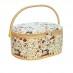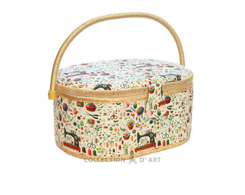 Description: There are a plastic insert with dividers, pincushion and a pocket for small parts storage inside of a sewing box.