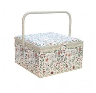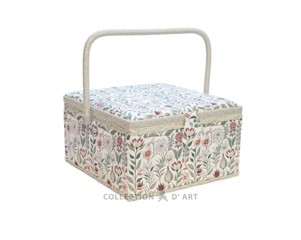 Description: There are a plastic insert with dividers, pincushion and a pocket for small parts storage inside of a sewing box.